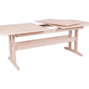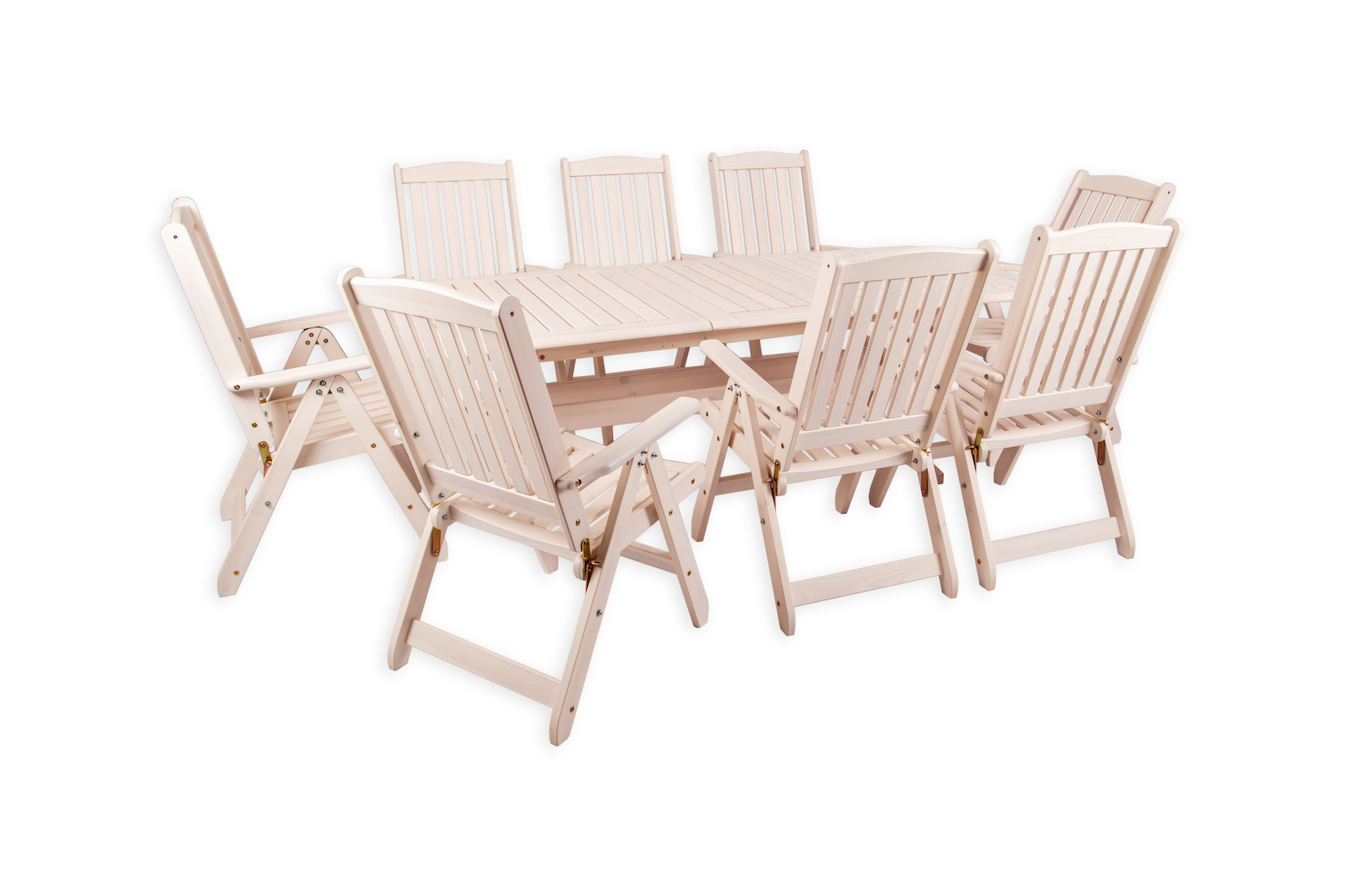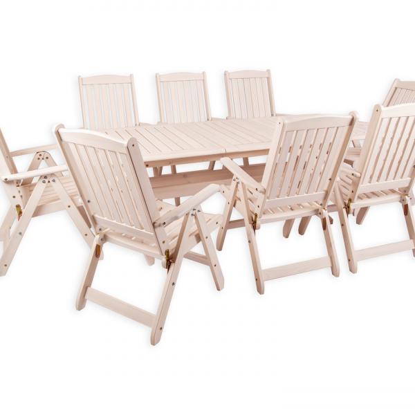- Izvelkams galds ar papildus sekciju + 8 salokāmi krēsli ar roku balstiem un regulējamu atzveltni.