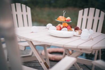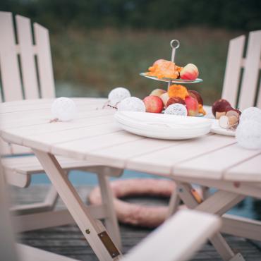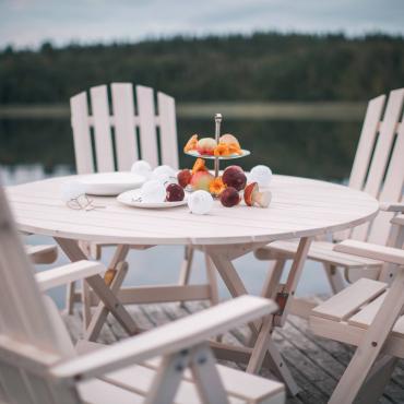 - Apaļš, salokāms galds + 4 salokāmi krēsli ar roku balstiem un regulējamu atzveltni.