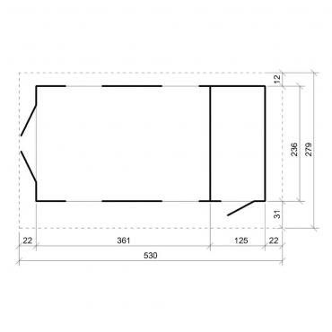 - Kopmplektā iekļauts bitumena šindeļu jumta segums pelēkā krāsā, kā arī metāla karnīzes pa jumta perimetru