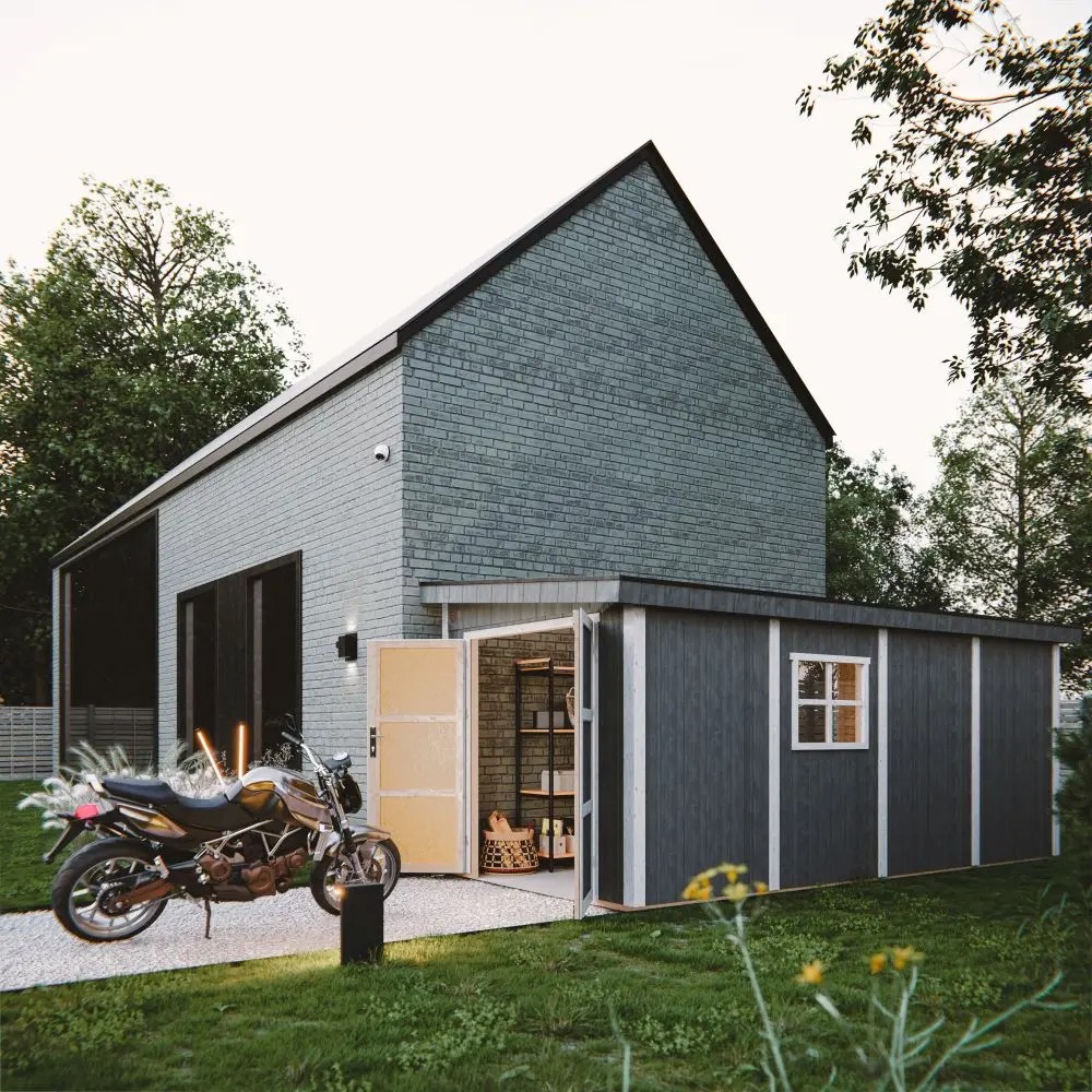 - Kopmplektā iekļauts bitumena šindeļu jumta segums pelēkā krāsā, kā arī metāla karnīzes pa jumta perimetru