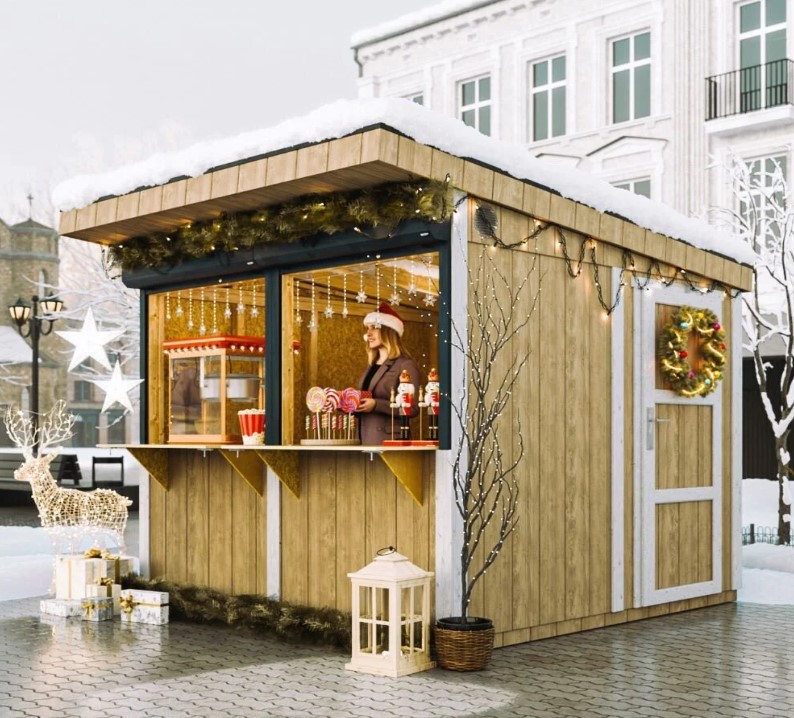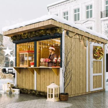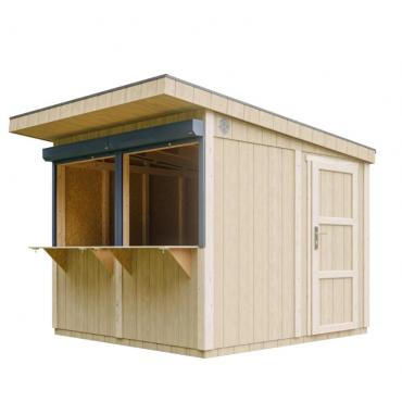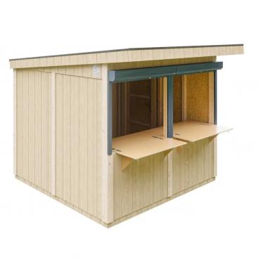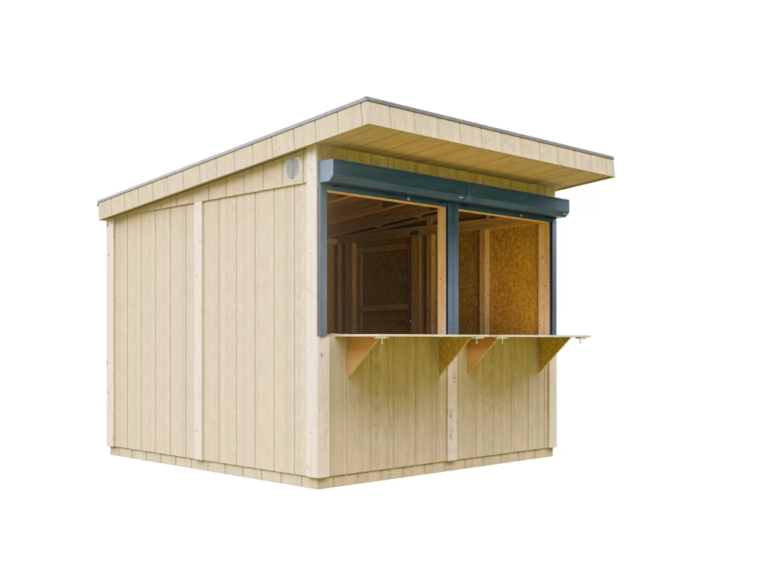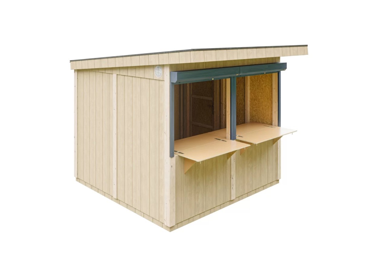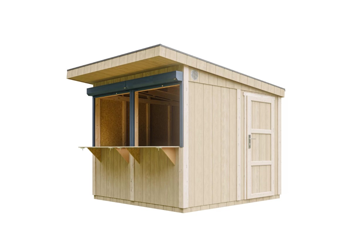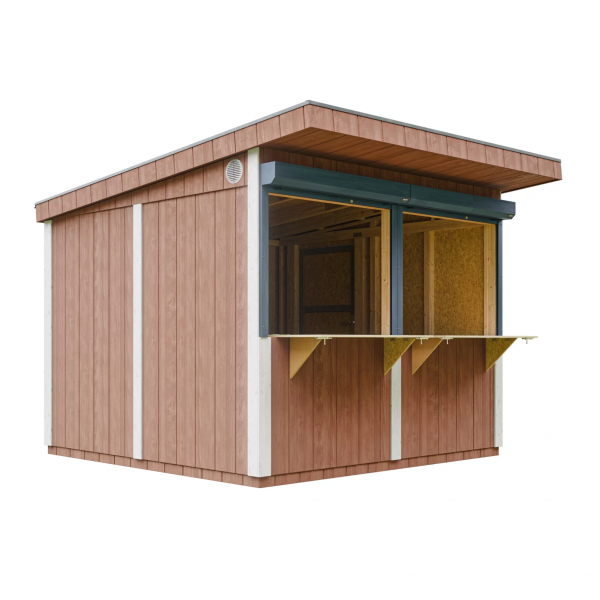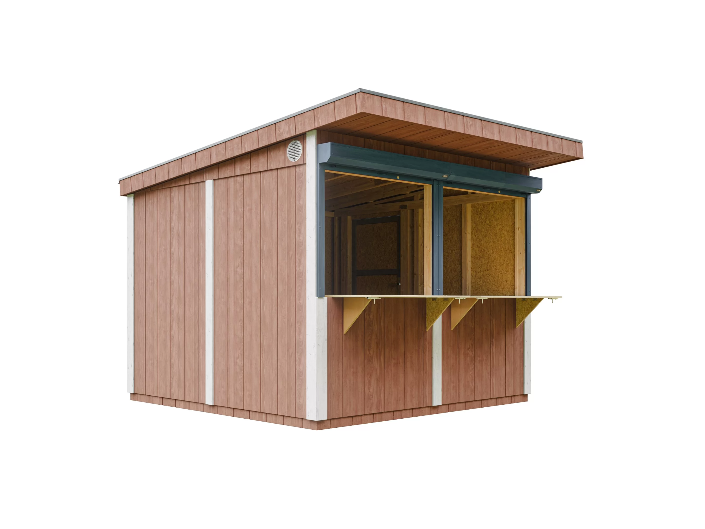 Kioska izturīgais, modernais un minimālistiskais dizains ir ideāla izvēle brīvdabas tirdzniecībai, gadatirgiem, tirgiem vai pagaidu pārdošanai svētku laikā. - LP® SmartSide® paneļiem raksturīga īpaša izturība pret apkārtējās vides iedarbību, deformācijām, sēnītēm, kukaiņiem un puvi. Paneļu pamatā ir koka skaidas, kas sapresētas ražošanas procesā kopā ar izturīgām, pret klimata ietekmi azsargājošām saistvielām.
