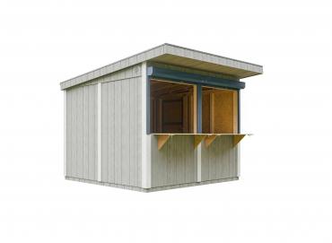- Kiosks pamatkomplektā iekļauts LP® ProStruct® grīdas segums un pelēku bitumena dakstiņu jumta segumu. Pateicoties paneļu konstrukcijai, paneli ar durvīm var novietot vēlamajā vietā.