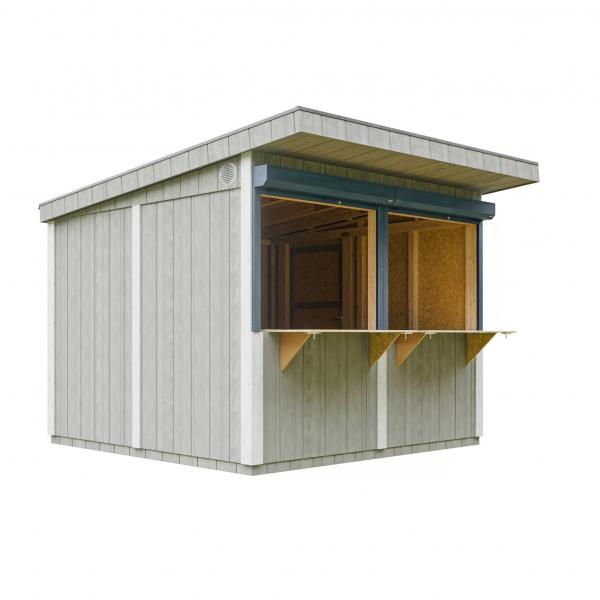 Kioska izturīgais, modernais un minimālistiskais dizains ir ideāla izvēle brīvdabas tirdzniecībai, gadatirgiem, tirgiem vai pagaidu pārdošanai svētku laikā. - LP® SmartSide® paneļiem raksturīga īpaša izturība pret apkārtējās vides iedarbību, deformācijām, sēnītēm, kukaiņiem un puvi. Paneļu pamatā ir koka skaidas, kas sapresētas ražošanas procesā kopā ar izturīgām, pret klimata ietekmi azsargājošām saistvielām.