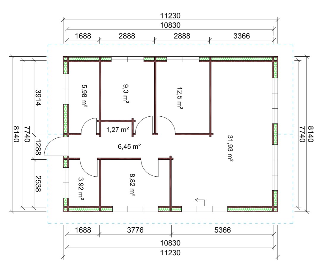 - Iespējama ārsienu siltināšana no ārpuses, vai iekšpuses (koka karkass pildīts ar akmensvati, vai ekovati, apdare ar frēzbaļķi imitējošiem dēļiem, vai cita veida materiāliem).