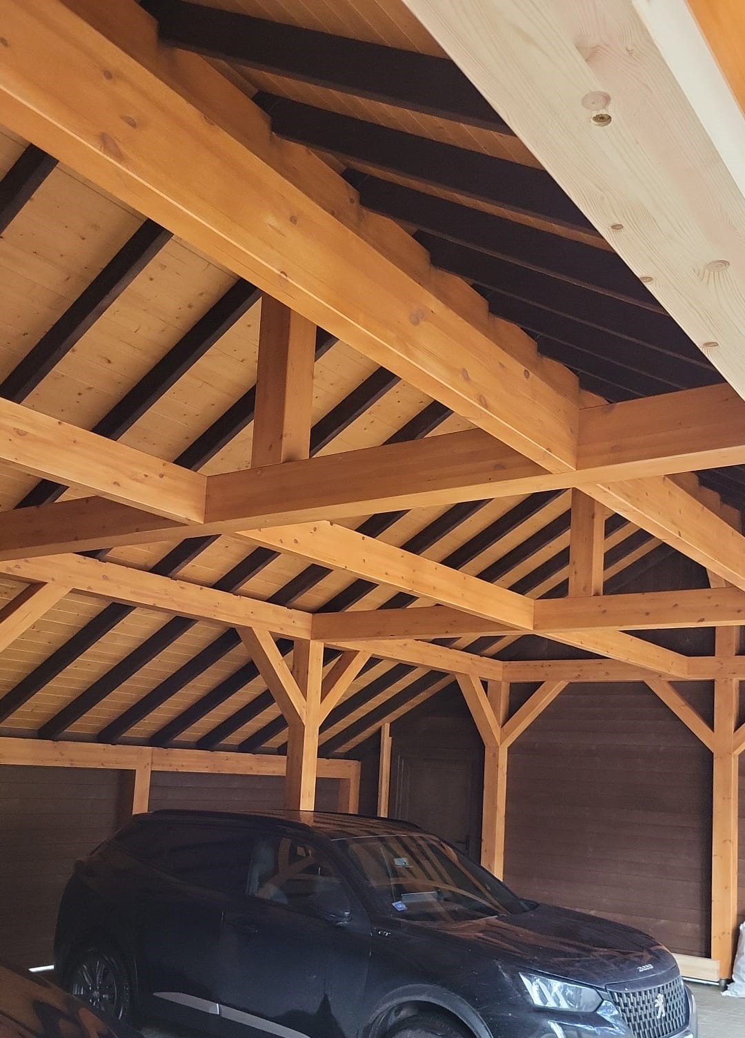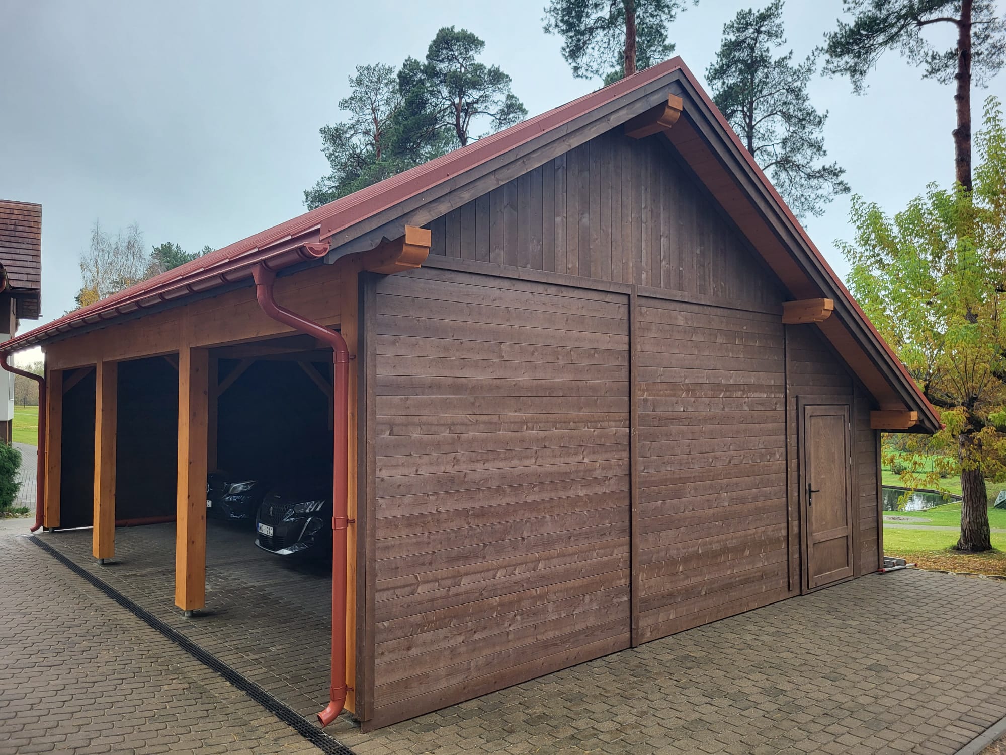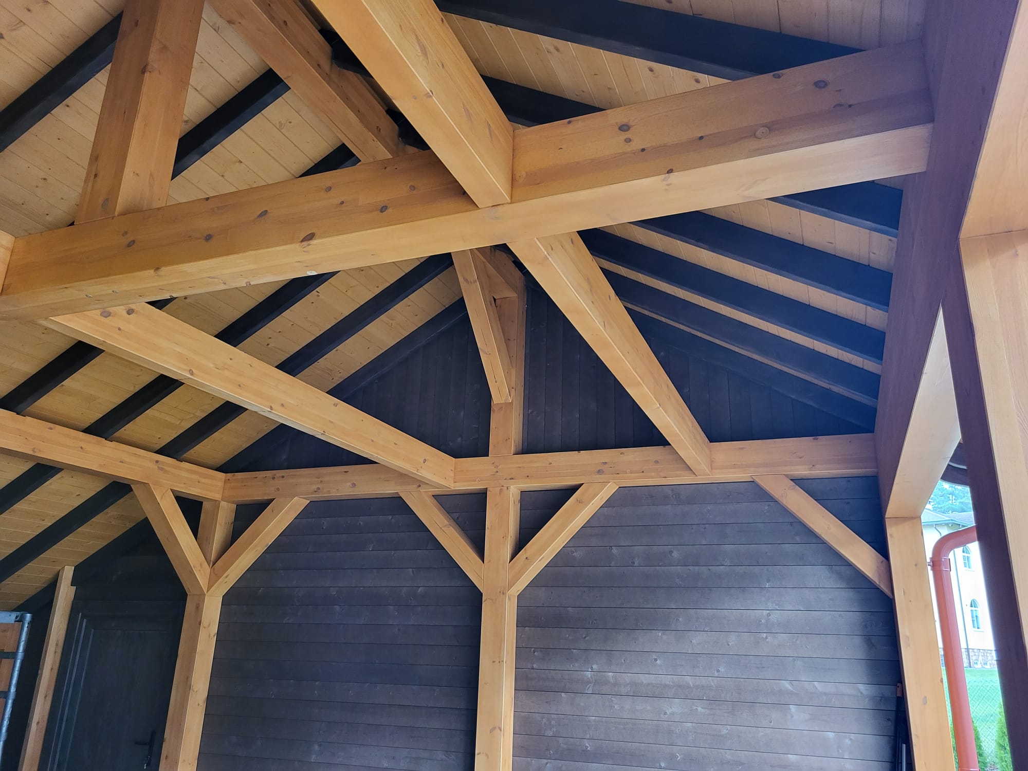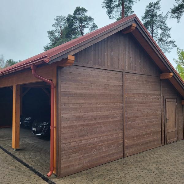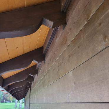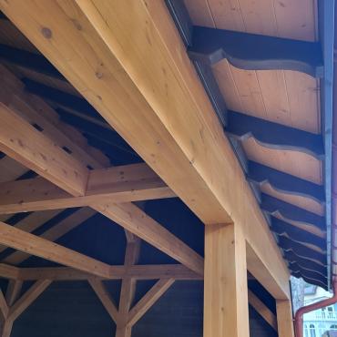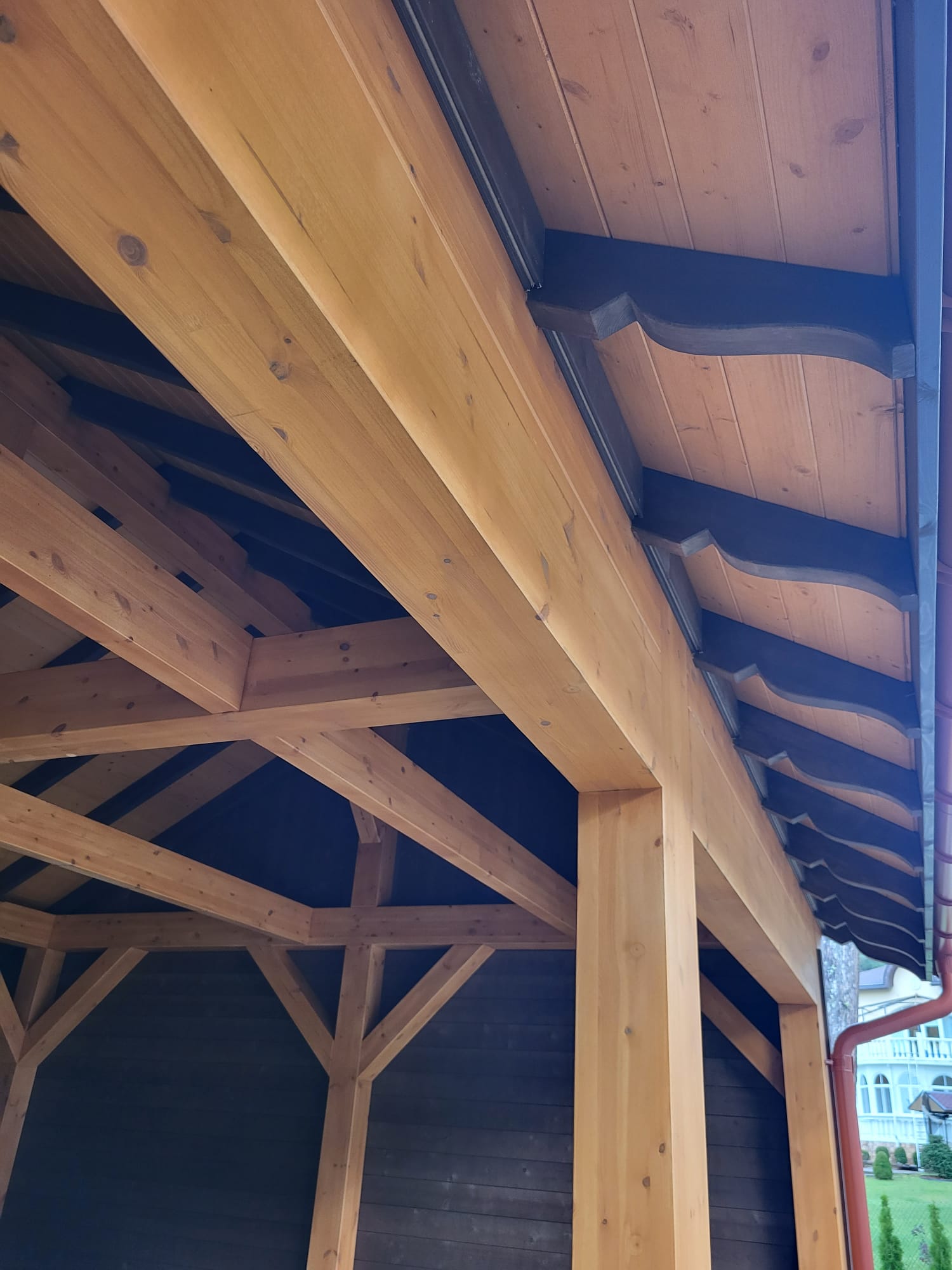 - Навес изготовлен полностью из клеенново бруса (конструкция на 70% прочнее чем из массивново бруса):