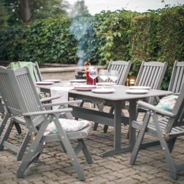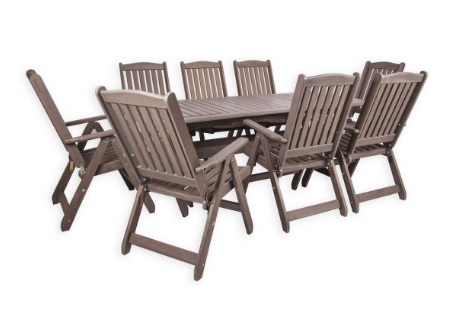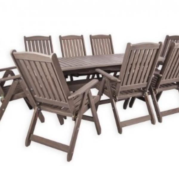 - Izvelkams galds ar papildus sekciju + 8 salokāmi krēsli ar roku balstiem un regulējamu atzveltni.