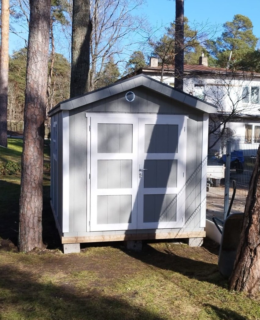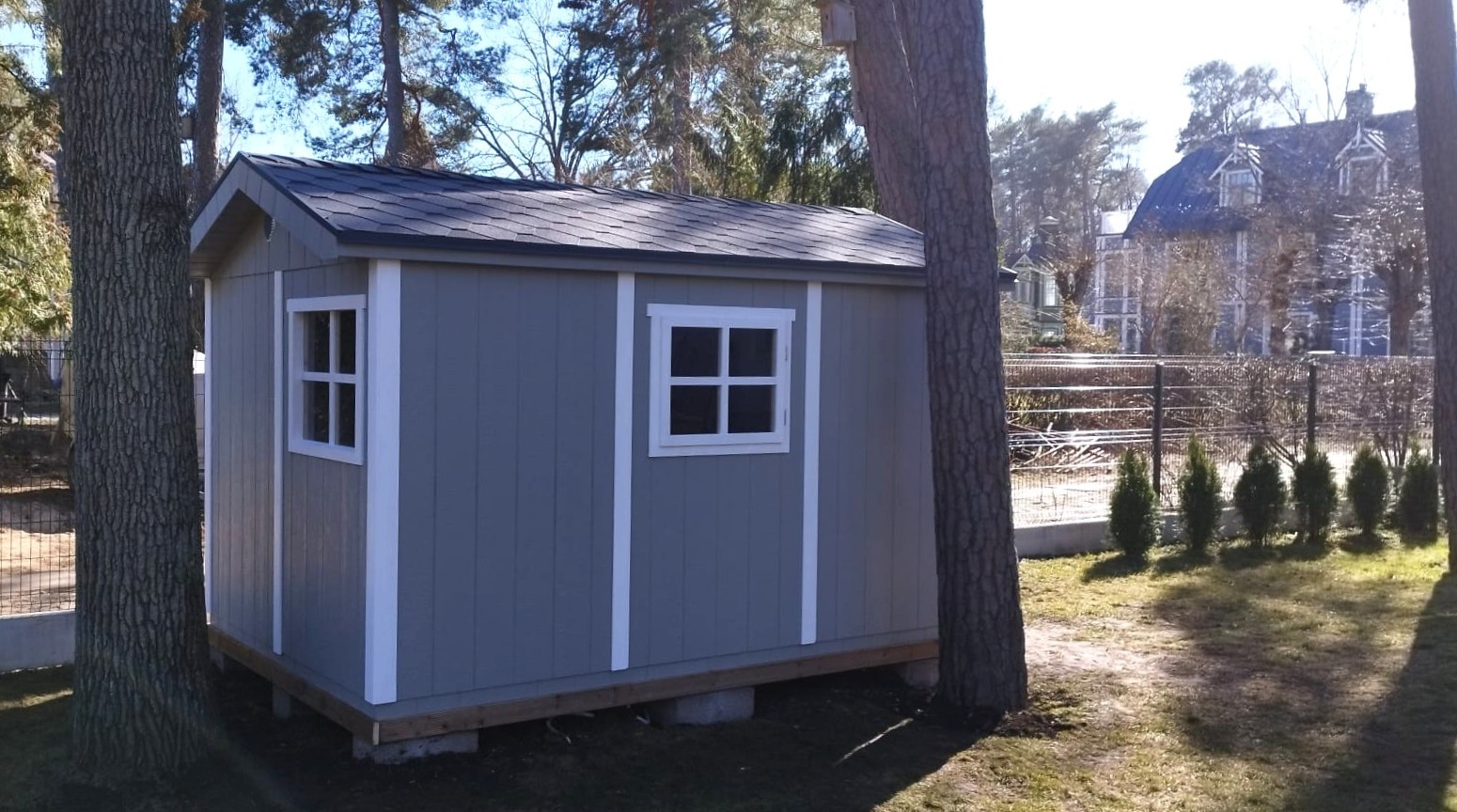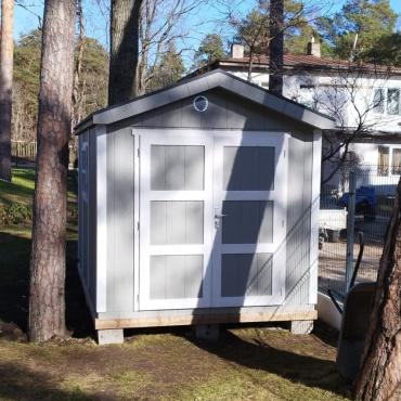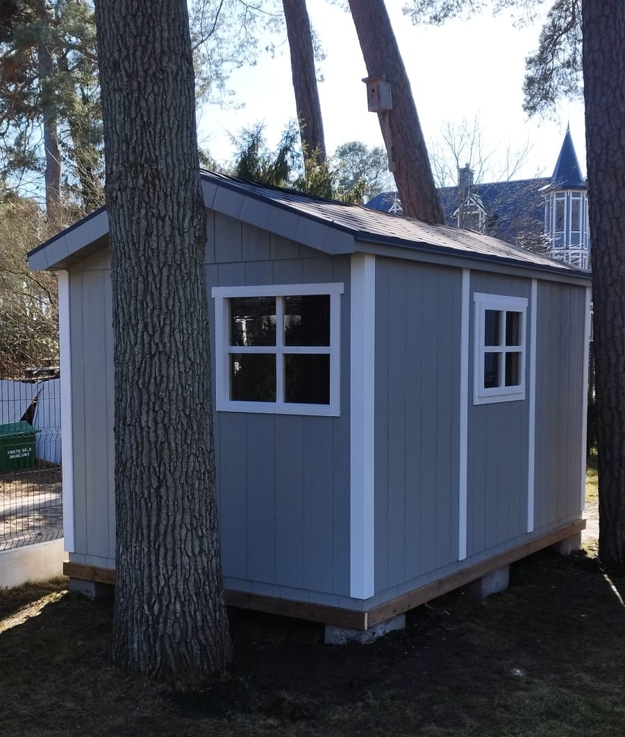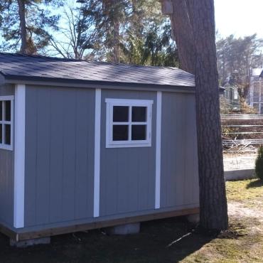 • Kopmplektā iekļauts bitumena šindeļu jumta segums pelēkā krāsā, kā arī metāla karnīzes pa jumta perimetru