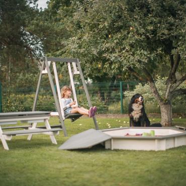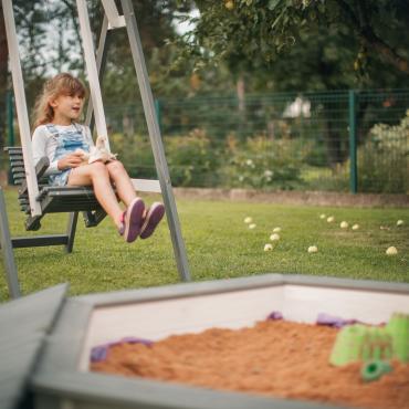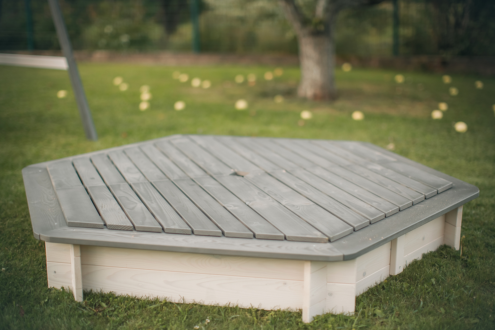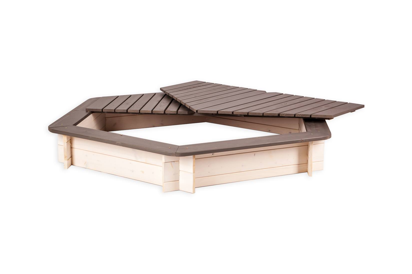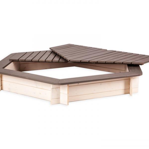 - Vienkārša, klasiska sešstūra smilšu kaste ar noņemamu vāku.